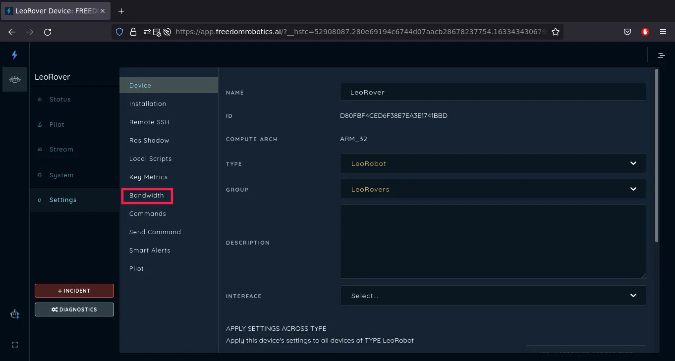 Now, connect to your device via Freedom Robotics and go to the device Settings and then go to the Bandwidth section.